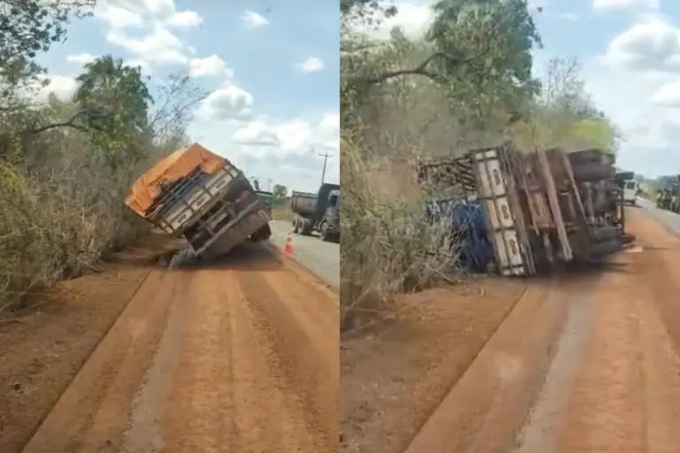 O acidente ocorreu enquanto o caminhão aguardava a liberação do tráfego, que também operava em meia pista devido às obras de recuperação executadas pelo Exército. Segundo informações, a carga se deslocou lateralmente, provocando o tombamento do veículo. Apesar do susto, não houve registro de feridos.