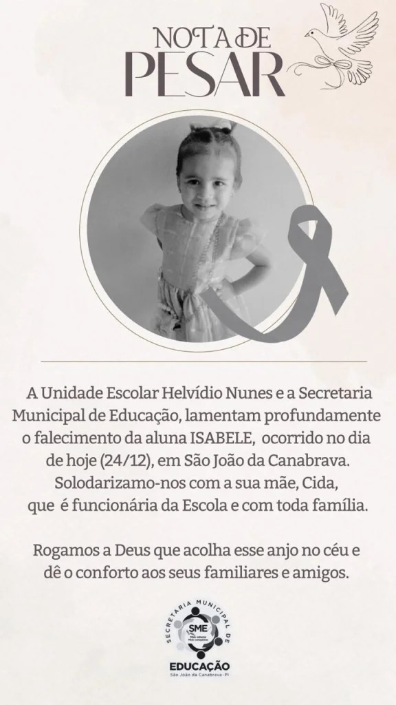 Em nota, a Secretaria Municipal de Educação lamentou a morte da criança. A mãe de Isabele é servidora da Unidade Escolar Helvídio Nunes, onde a menina estava matriculada.