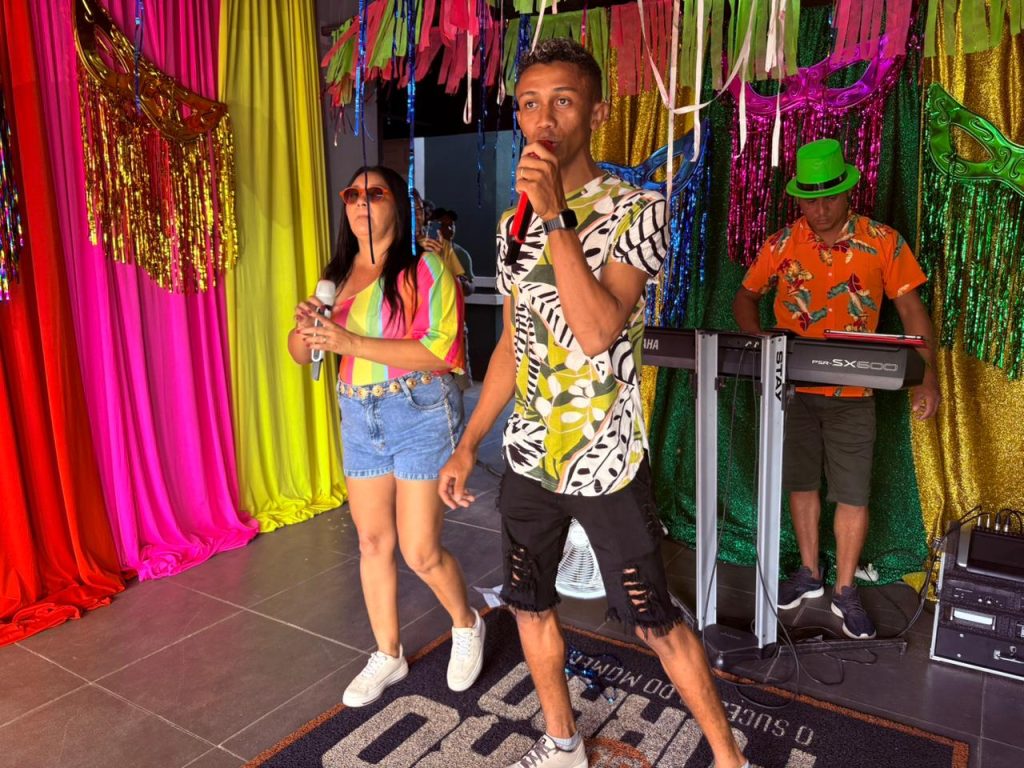 Feirantes, comerciantes e consumidores participaram da programação especial, que transformou o espaço em um ambiente festivo e de integração. A animação ficou por conta da banda Piseiro do Forró, que levantou o público com um repertório contagiante, garantindo clima carnavalesco e grande participação popular.