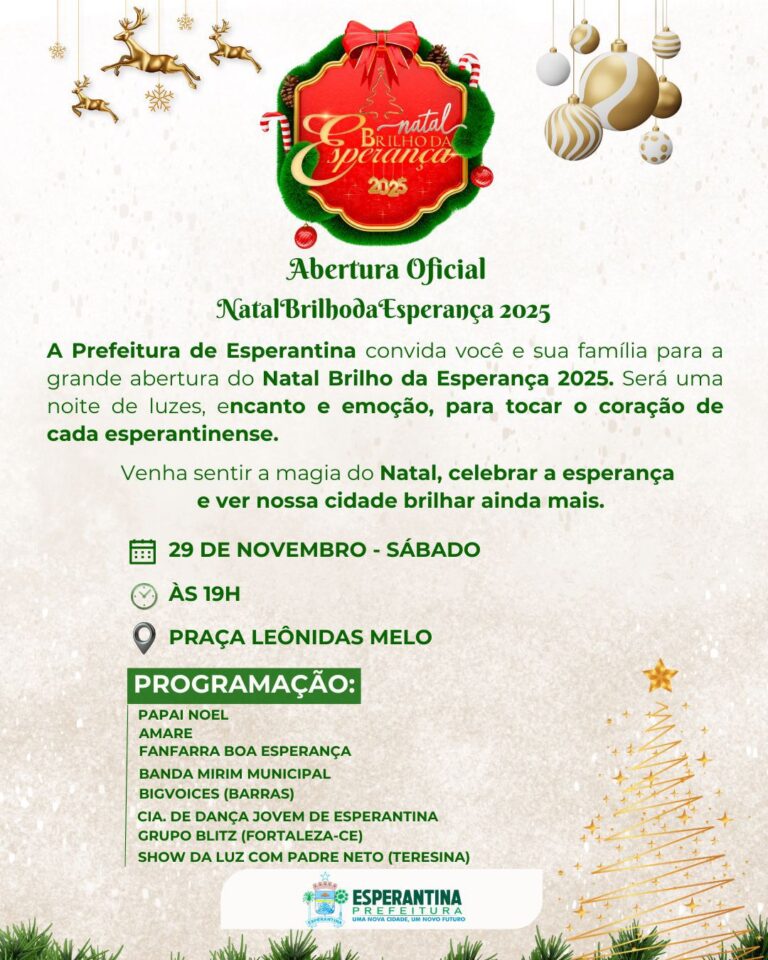 A magia do Natal vai tomar conta de Esperantina no dia 29 de novembro, com a abertura oficial do Natal Brilho da Esperança 2025, promovido pela Prefeitura Municipal.
