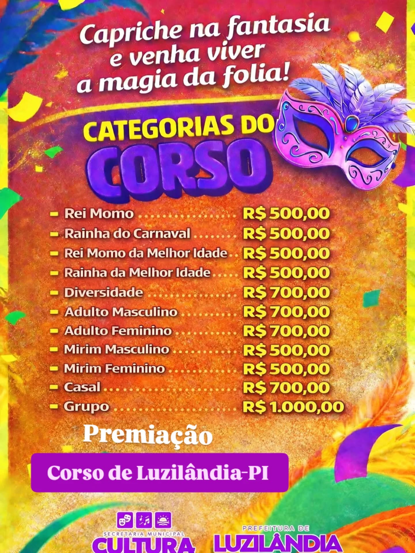 A Prefeitura de Luzilândia, através da sua Secretaria Municipal de Cultura e Turismo realizará nesse ano um grande CORSO carnavalesco no município.