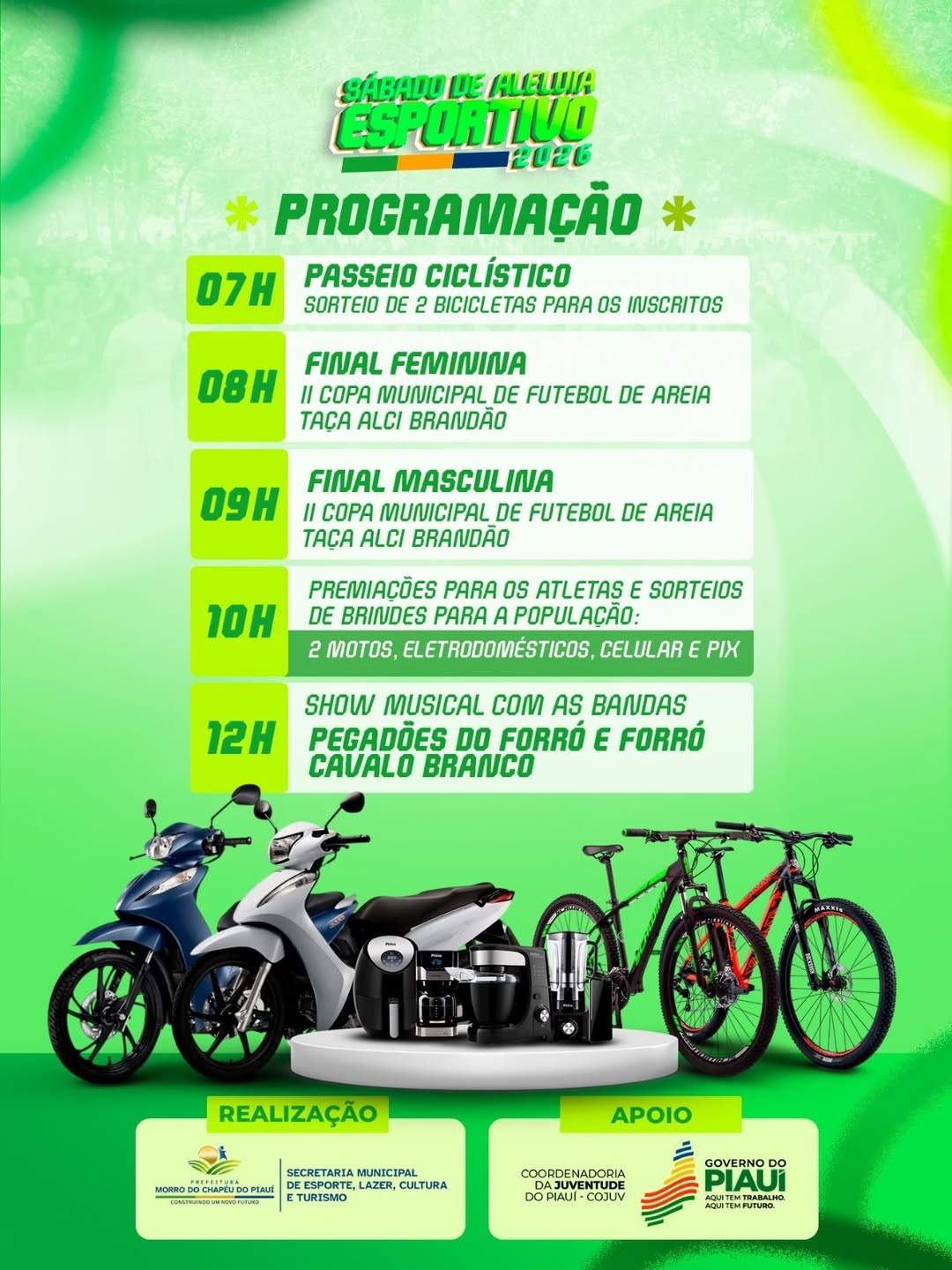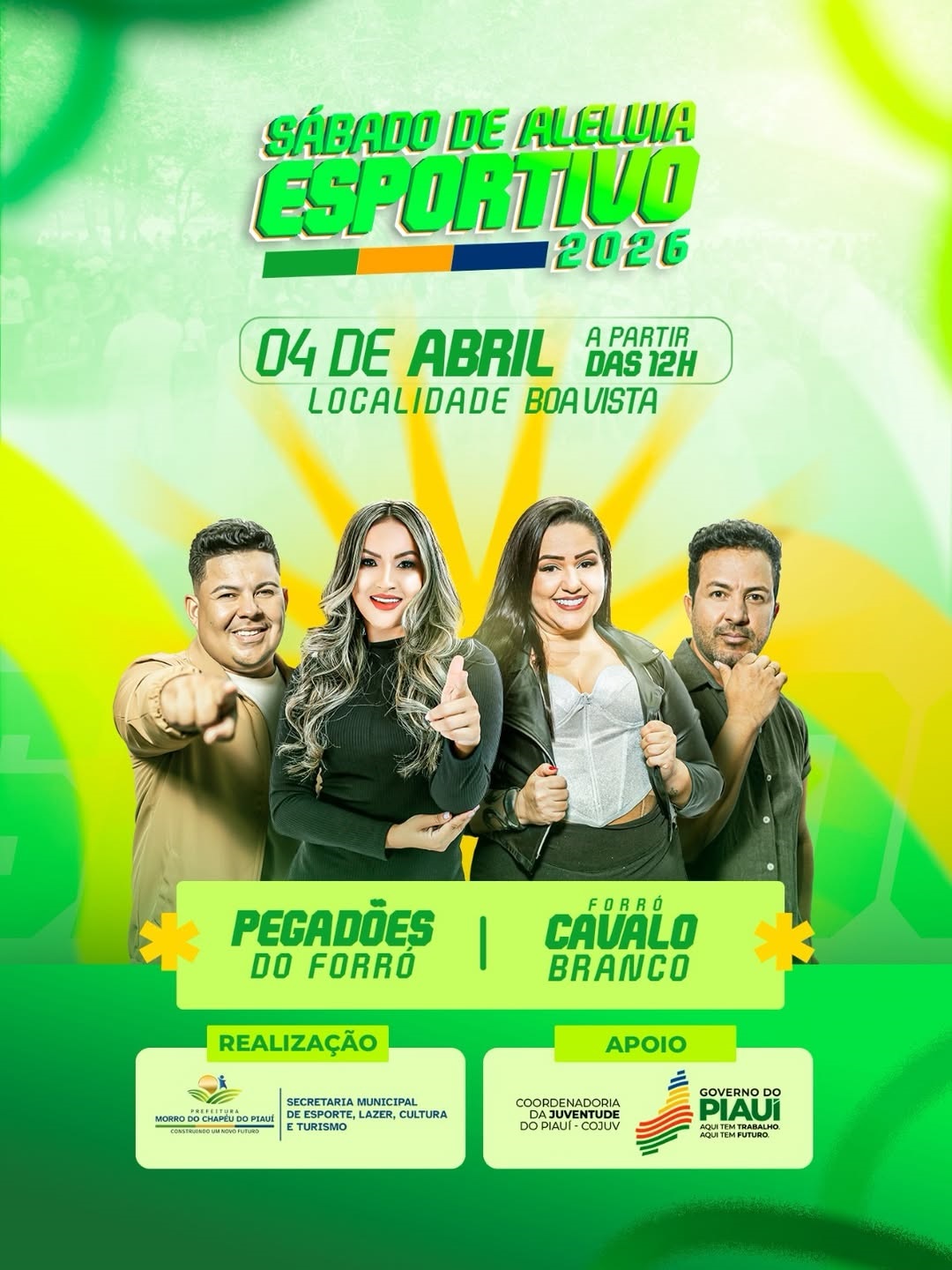A Prefeitura de Morro do Chapéu do Piauí, divulgou a programação oficial do Sábado de Aleluia Esportivo e Cultural, que será realizado no dia 4 de abril, na localidade Boa Vista, com início previsto para as 7h.