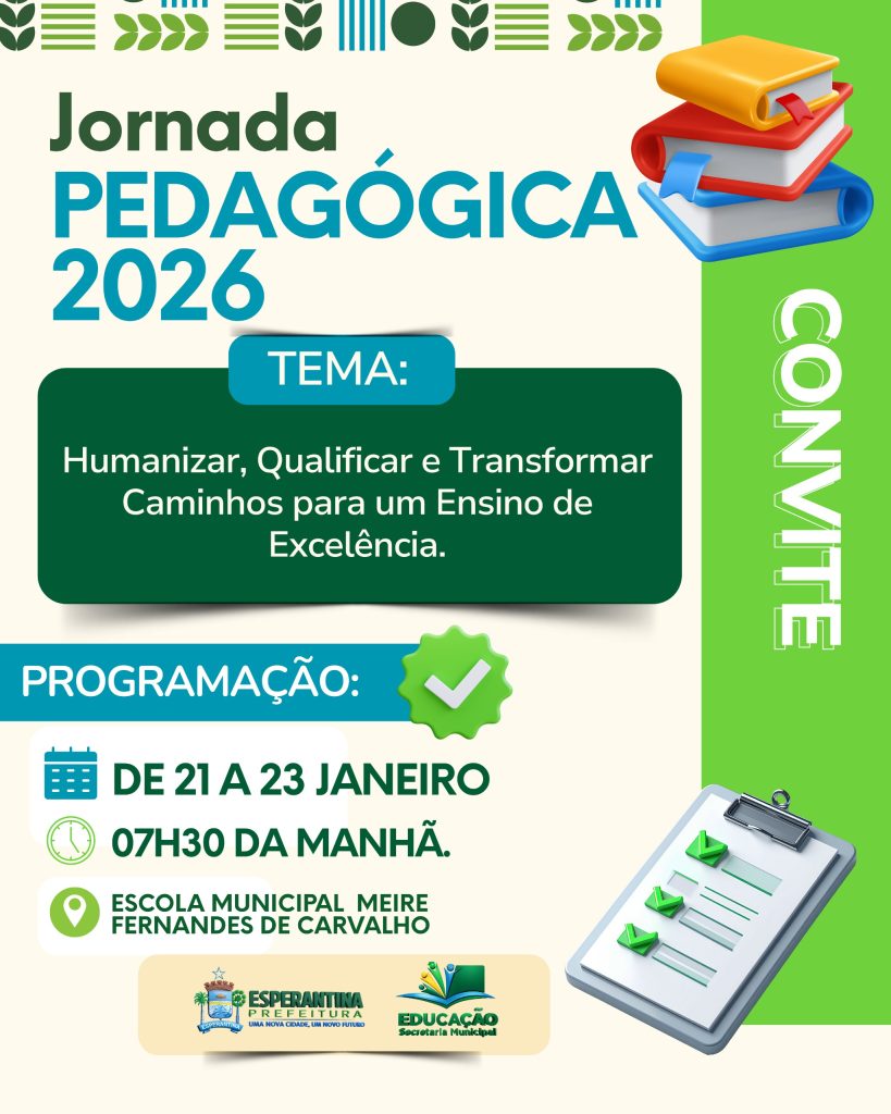 A Prefeitura de Esperantina, por meio da Secretaria Municipal de Educação, realizará a Jornada Pedagógica 2026, um evento estratégico voltado ao planejamento do ano letivo e ao fortalecimento das ações educacionais no município.