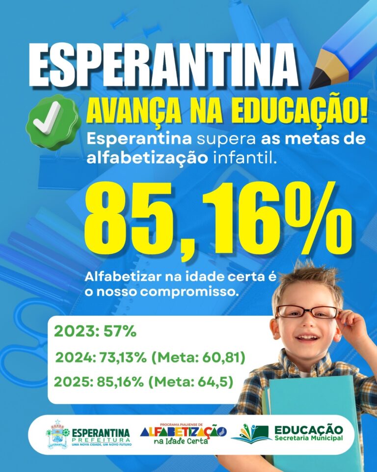 O resultado é reflexo de investimentos em capacitação docente, material didático direcionado e o acompanhamento próximo de cada aluno. Ao superar a meta de 2025 em mais de 20 pontos percentuais, Esperantina se consolida como uma referência regional no esforço para garantir que todas as crianças aprendam a ler e escrever na idade certa.