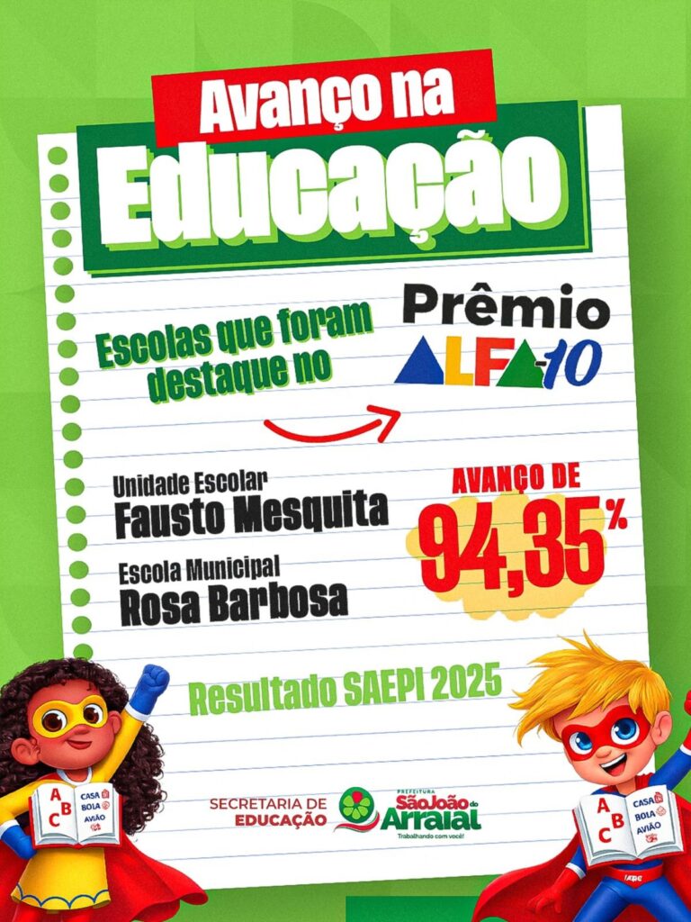 “Esse resultado é motivo de muito orgulho para todos nós. Ele demonstra a dedicação e o compromisso da nossa rede de ensino com a aprendizagem dos alunos desde os primeiros anos. É uma vitória construída com muito empenho por todos que fazem a educação em São João do Arraial”, afirmou.