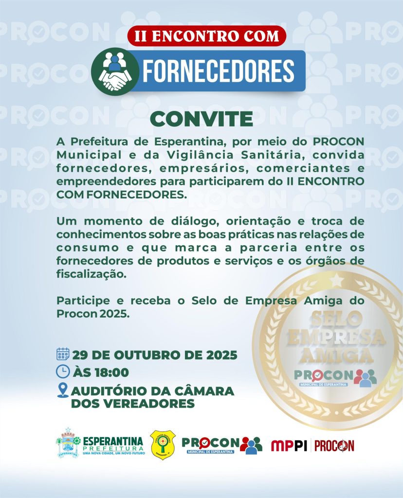 A Prefeitura de Esperantina, por meio do PROCON Municipal e da Vigilância Sanitária, realizará o II Encontro com Fornecedores, um momento voltado para o diálogo, a orientação e a troca de conhecimentos sobre as boas práticas nas relações de consumo.