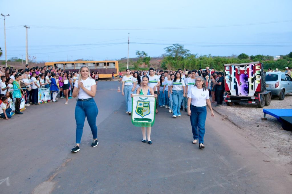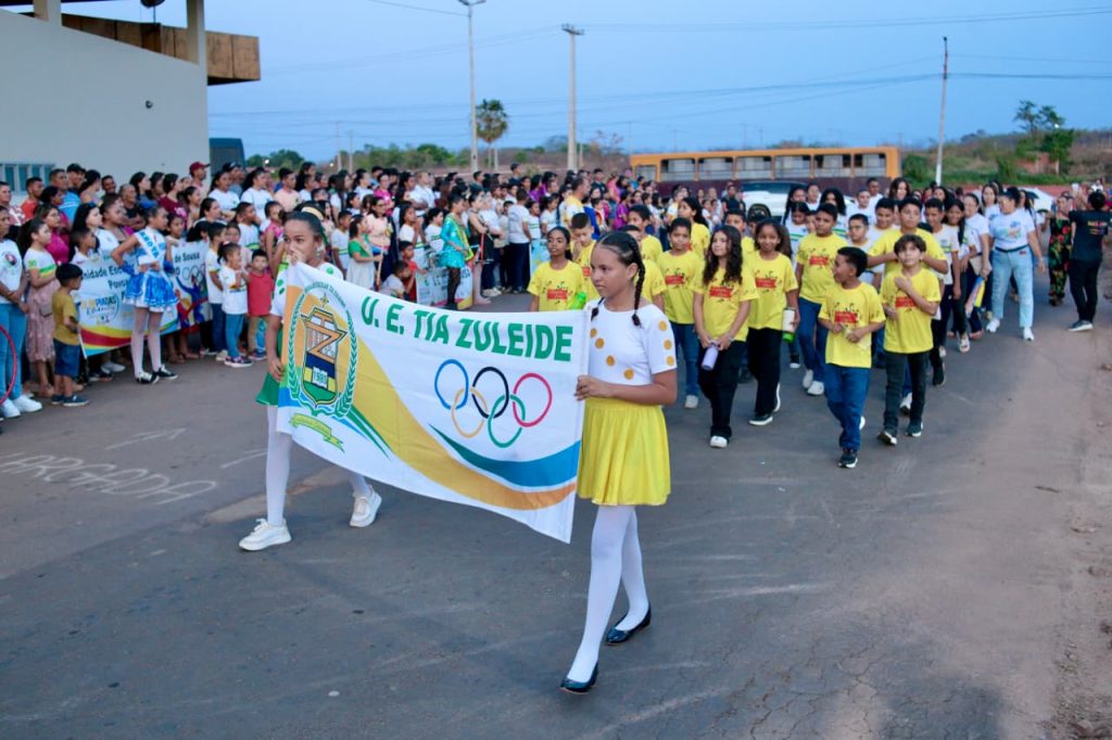 A solenidade contou com a apresentação das delegações das escolas das redes municipal e estadual, celebrando o esporte, a integração e o companheirismo entre os estudantes.