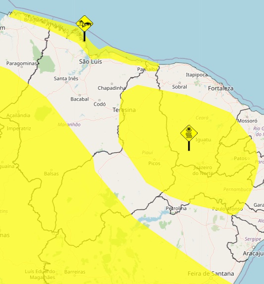 Já no extremo sul do Piauí, o aviso é para chuvas intensas. A previsão aponta precipitações entre 20 e 30 mm/h, podendo chegar a 50 mm/dia, acompanhadas de ventos fortes entre 40 e 60 km/h. Apesar disso, o risco de corte de energia elétrica, queda de galhos, alagamentos e descargas elétricas é considerado baixo.