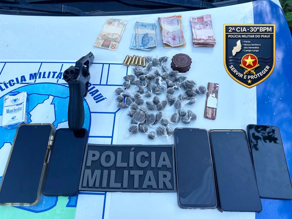 Na abordagem, os policiais apreenderam 62 invólucros de substância análoga à maconha, um revólver calibre .38 com munições, aparelhos celulares, dinheiro em espécie e três motocicletas, sendo uma delas com restrição de roubo ou furto.