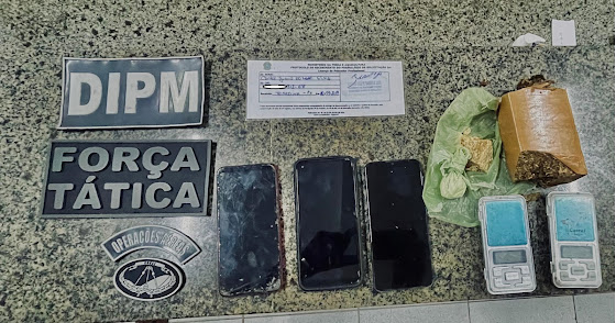 Na ação, foram apreendidas duas balanças de precisão, um tablete de maconha, uma porção de crack, uma porção de cocaína e três aparelhos celulares, sendo um deles com restrição de roubo.