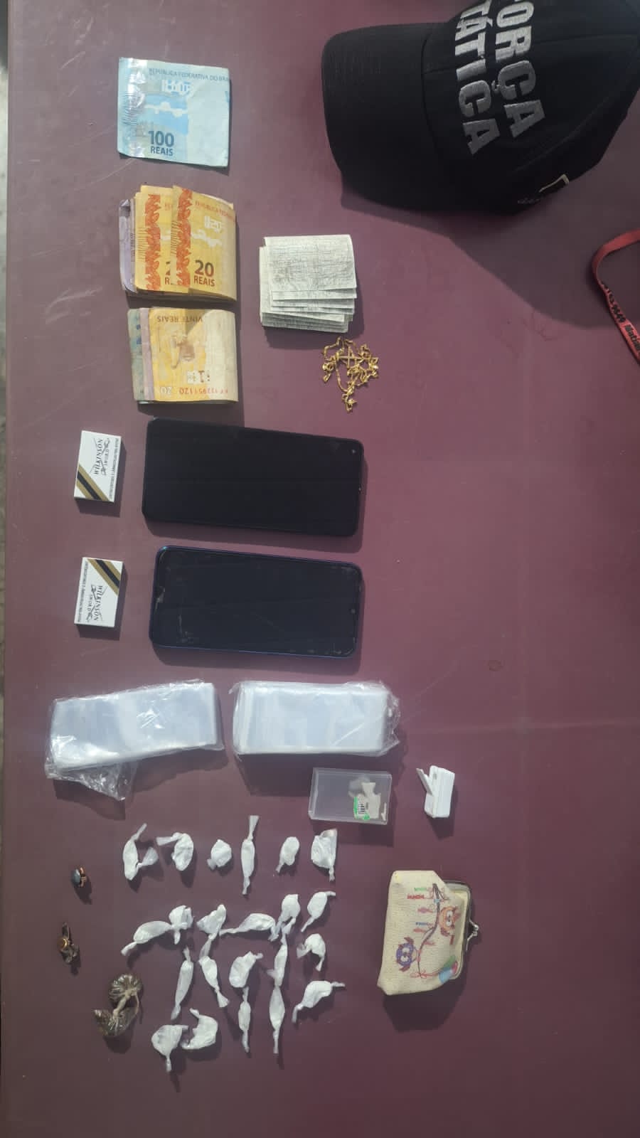 Ao chegar no local foi realizado a abordagem e apreendido na oportunidade uma grande quantidade em dinheiro, drogas e aparelhos celulares.