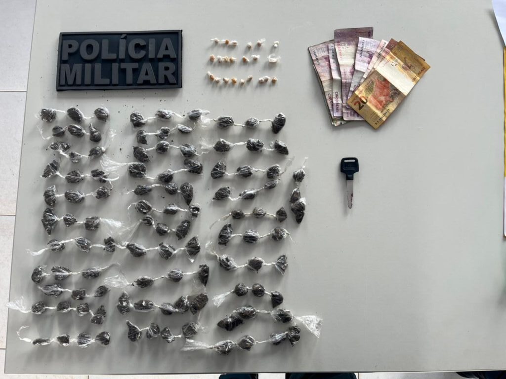 Durante a abordagem, foram encontradas com o suspeito, 22 pedras de crack. Na sequência, os policiais localizaram mais 108 papelotes de maconha, que teriam sido arremessadas pelo homem no interior de uma residência durante a tentativa de fuga.
