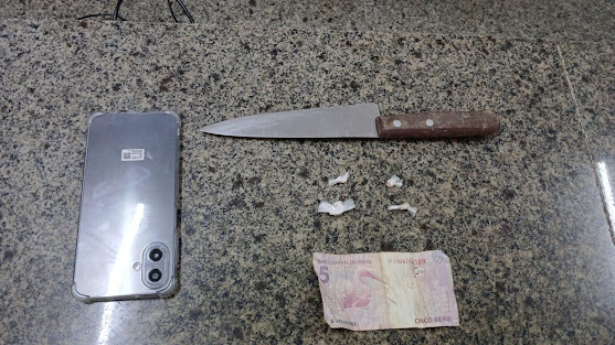 Na ação, foram apreendidos a faca utilizada pelo suspeito, entorpecentes, dinheiro em espécie e um aparelho celular. Um usuário que estava no local foi conduzido à delegacia para prestar esclarecimentos.