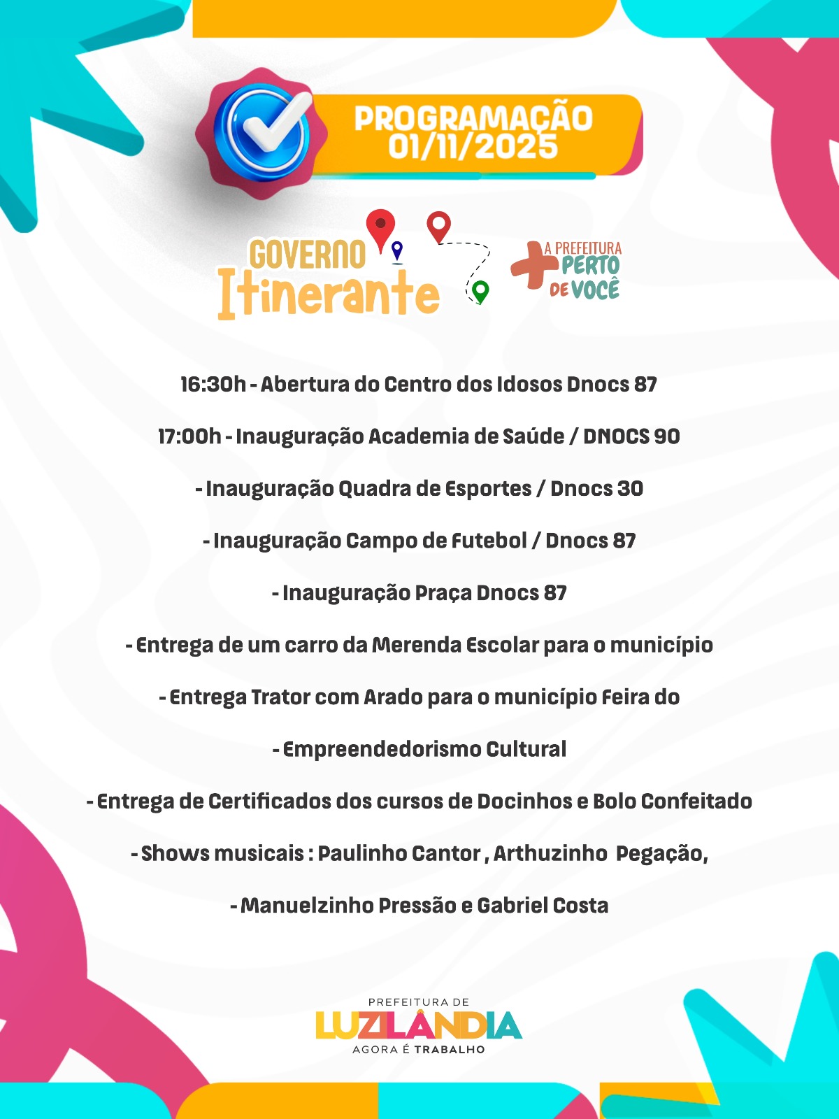A prefeita Fernanda Marques, convida toda a população luzilandense, para participar de mais uma edição do Governo Itinerante, hoje (01/11), com uma grande programação de inaugurações, entregas e shows musicais.