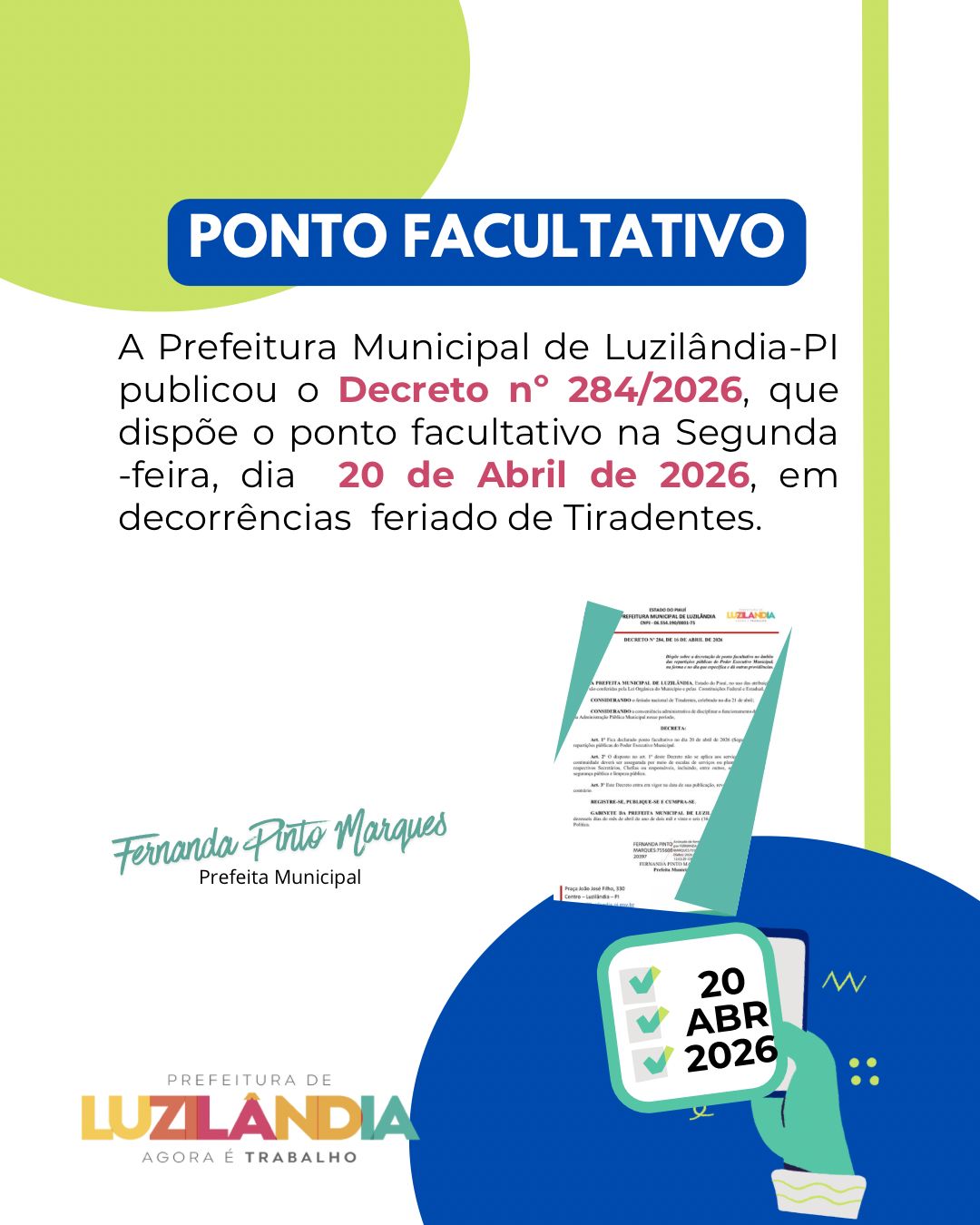 A Prefeitura de Luzilândia anunciou a publicação do Decreto nº 284/2026, que estabelece ponto facultativo na próxima segunda-feira (20/04), em razão do feriado de Tiradentes, comemorado na terça-feira (21/04).