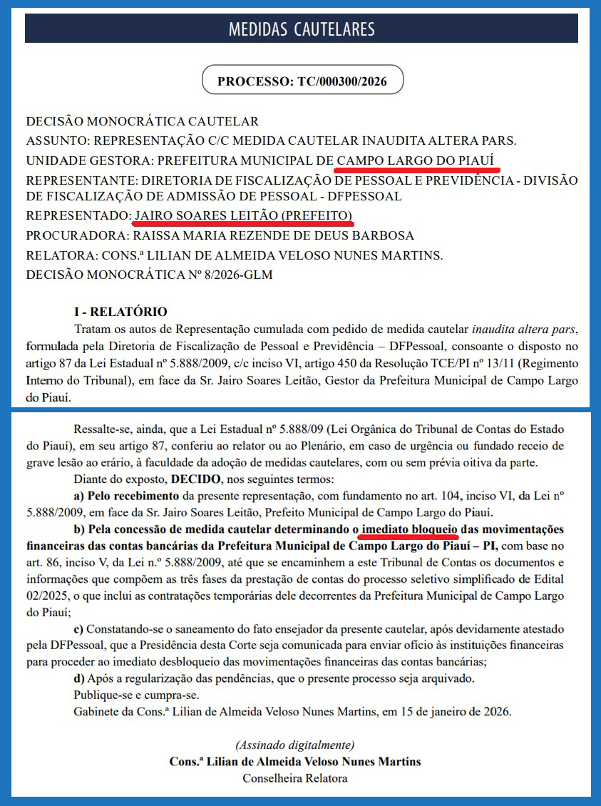 O Tribunal de Contas do Estado do Piauí (TCE-PI) determinou o bloqueio das movimentações financeiras das contas bancárias da Prefeitura de Campo Largo do Piauí (PI).