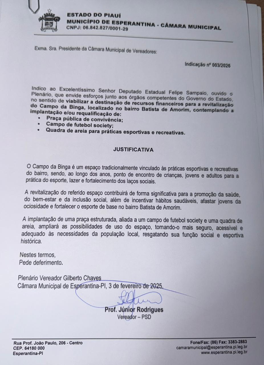 O Professor e Vereador esperantinense,  Junior Rodrigues,  deu entrada recentemente com um Indicativo para revitalização do antigo Campo da Binga em Esperantina.