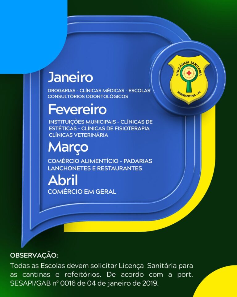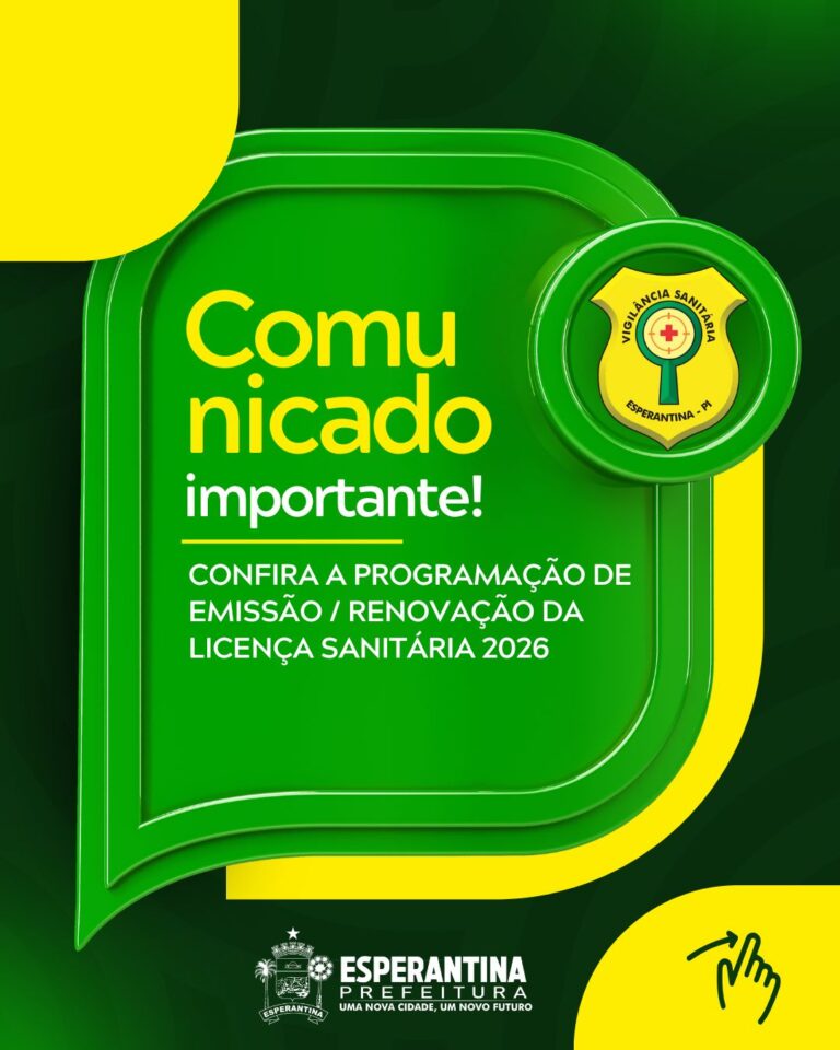 A Prefeitura de Esperantina, por meio do setor de Vigilância Sanitária, divulgou na última segunda-feira (08/12), o cronograma oficial para emissão e renovação da Licença Sanitária 2026 no município.