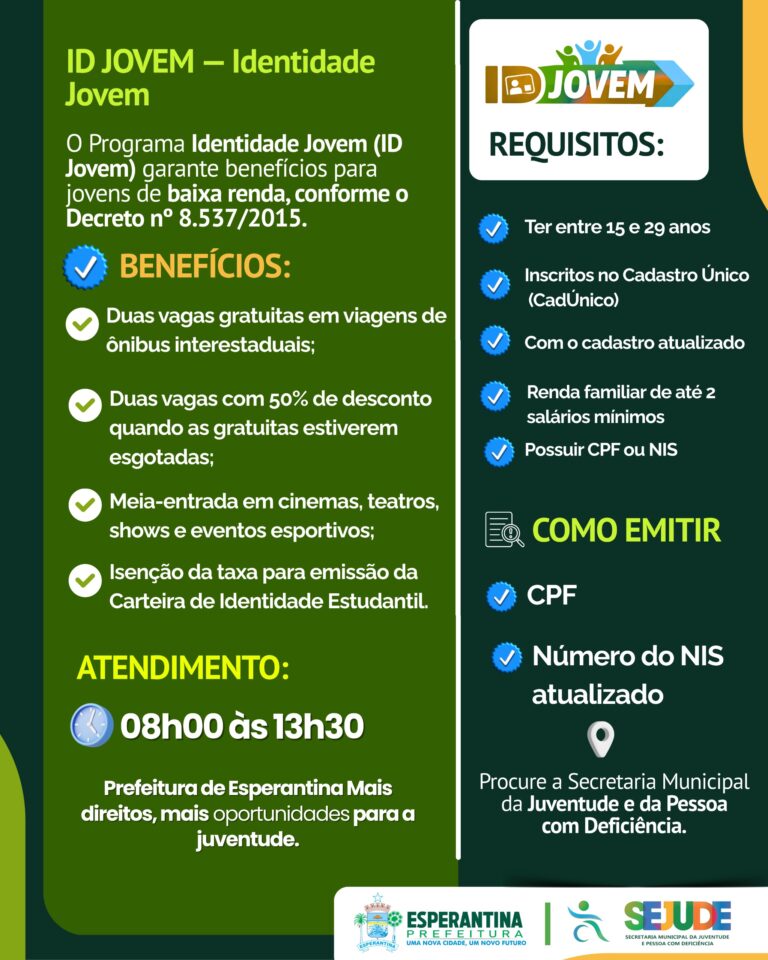 A Prefeitura de Esperantina, por meio da Secretaria Municipal da Juventude e da Pessoa com Deficiência (SEJUDE), está orientando a população sobre a emissão da Identidade Jovem (ID Jovem), documento que garante uma série de benefícios para jovens de baixa renda em todo o Brasil, conforme o Decreto nº 8.537/2015.