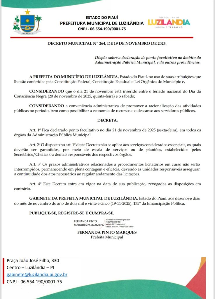 A Prefeitura de Luzilândia publicou, na última quarta-feira (19), o Decreto Municipal nº 264/2025, que estabelece ponto facultativo na próxima sexta-feira (21/11), em todos os órgãos da Administração Pública Municipal.