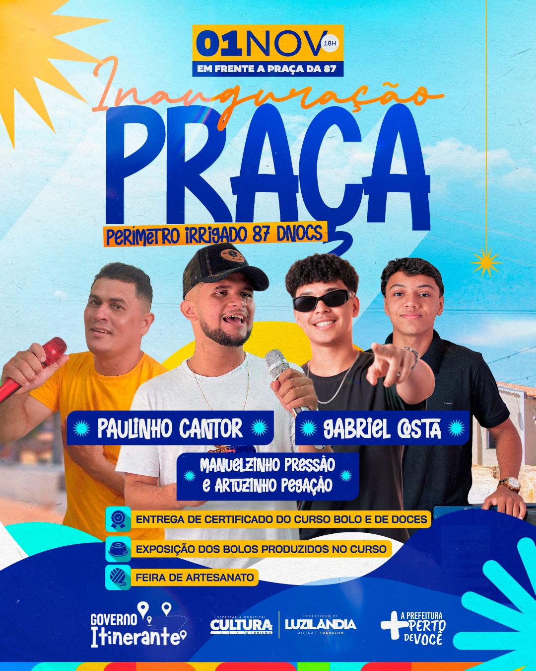 A Prefeitura Municipal de Luzilândia, através do programa Governo Itinerante, convida toda a população para participar da inauguração da Praça do Perímetro Irrigado 87 DNOCS, que acontecerá no próximo sábado (01/11), às 18h, em frente à nova praça.