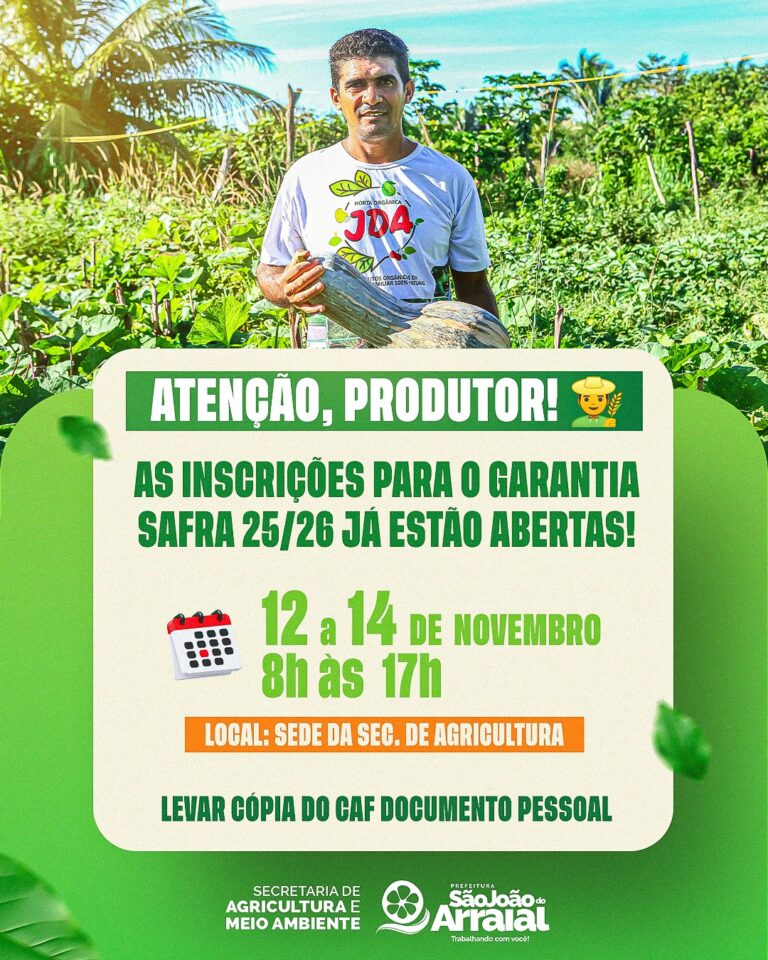 A Prefeitura de São João do Arraial anunciou a adesão ao programa Garantia-Safra 2025/2026, do Ministério do Desenvolvimento Agrário e Agricultura Familiar (MDA), que oferece apoio financeiro de R$ 1.200 às famílias que tiverem perdas na produção agrícola devido à seca ou excesso de chuvas.