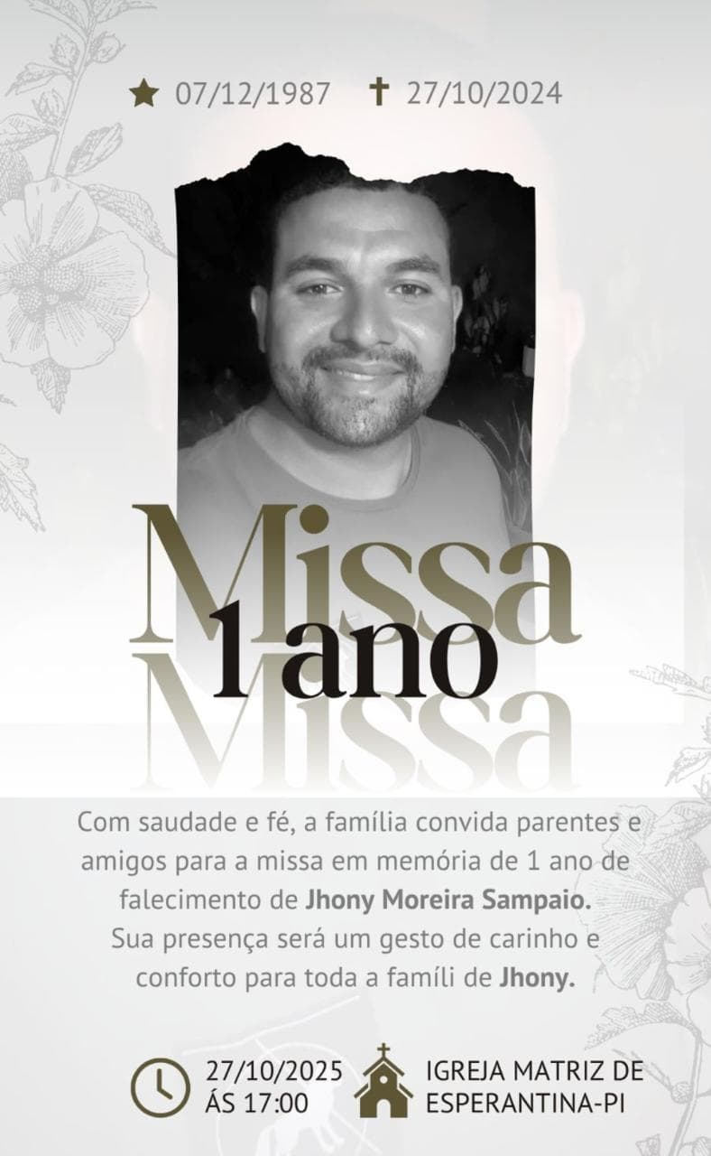 Os familiares do esperantinense, Jhony Moreira Sampaio, ainda bastante contornados com o seu falecimento, convidam amigos e parentes para a missa de um ano a ser celebrada hoje (27/10), em sufrágio de sua alma.