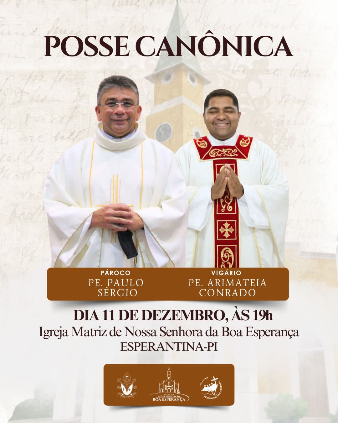 A Paróquia de Nossa Senhora da Boa Esperança realiza na próxima quinta-feira (11/12), a Posse Canônica do novo Pároco, Padre Paulo Sérgio e do novo Vigário, Padre Arimateia Conrado.