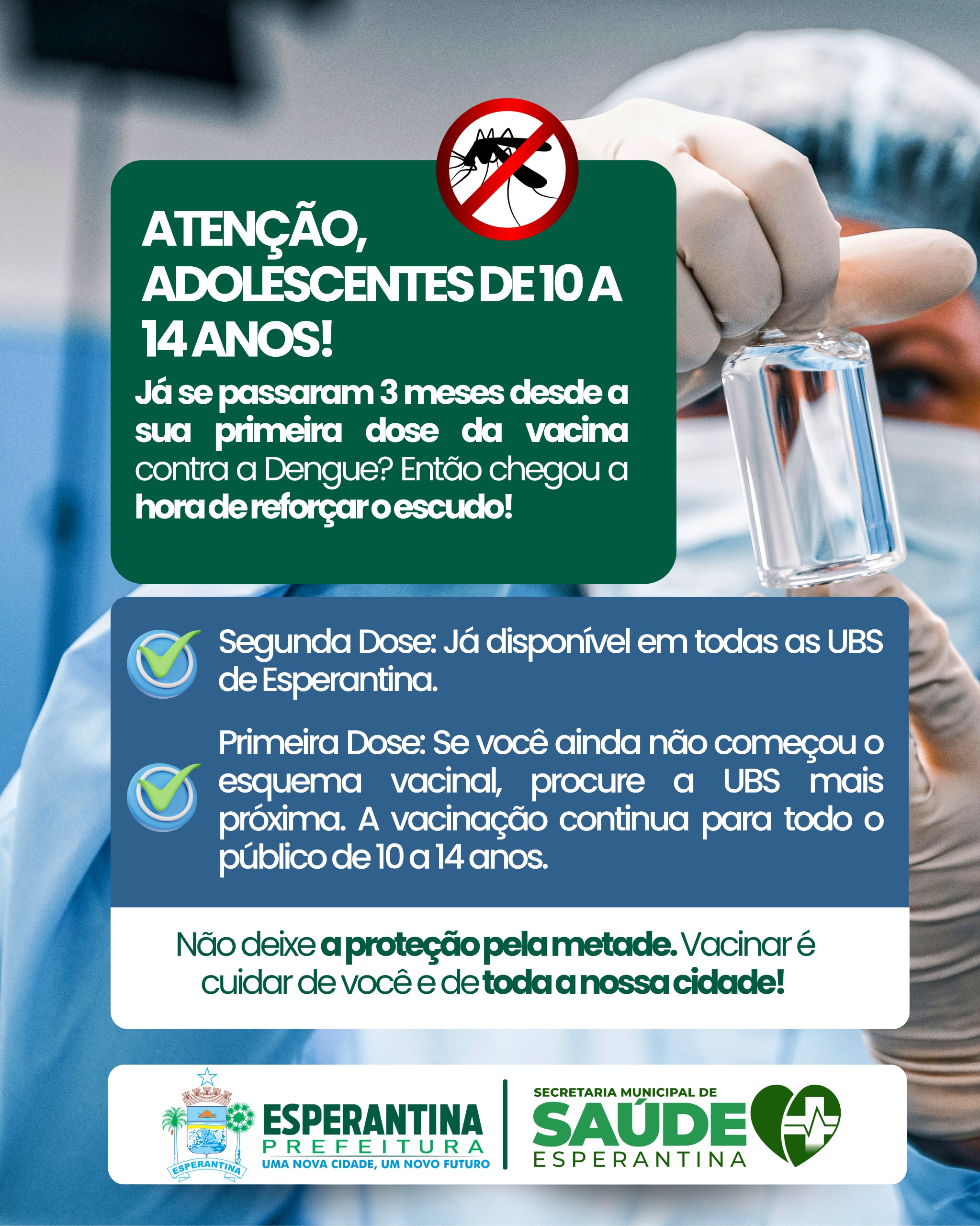 Para quem ainda não iniciou o processo de imunização, a primeira dose segue disponível em todas as unidades de saúde da cidade. A Secretaria de Saúde pontua que a vacinação é uma estratégia fundamental para o controle da dengue em Esperantina, protegendo tanto o cidadão individualmente quanto a coletividade.