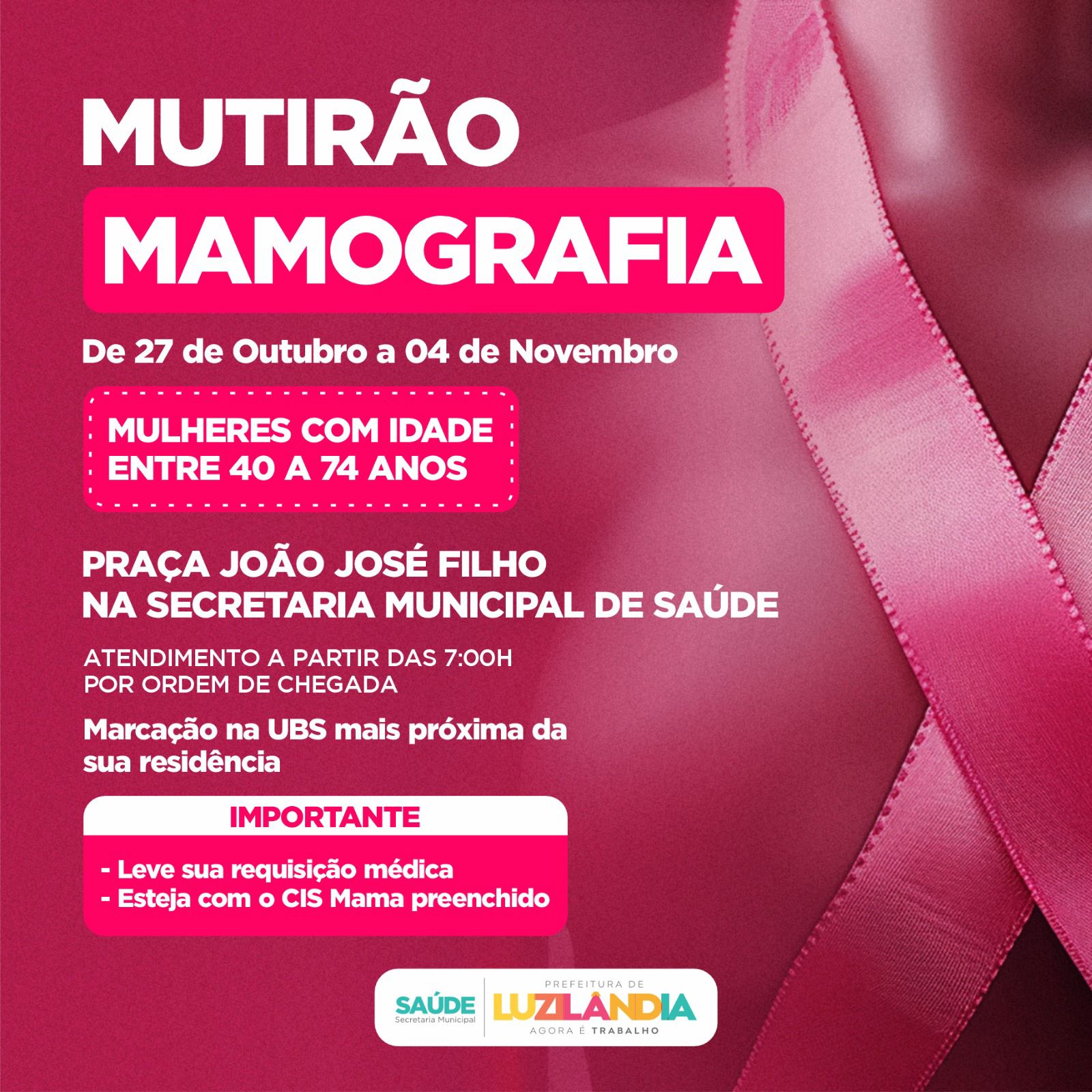 A Prefeitura de Luzilândia, através da sua Secretaria Municipal de Saúde, realizará no período de 27 desse mês, a 04 de novembro, o Mutirão de Mamografia no município.